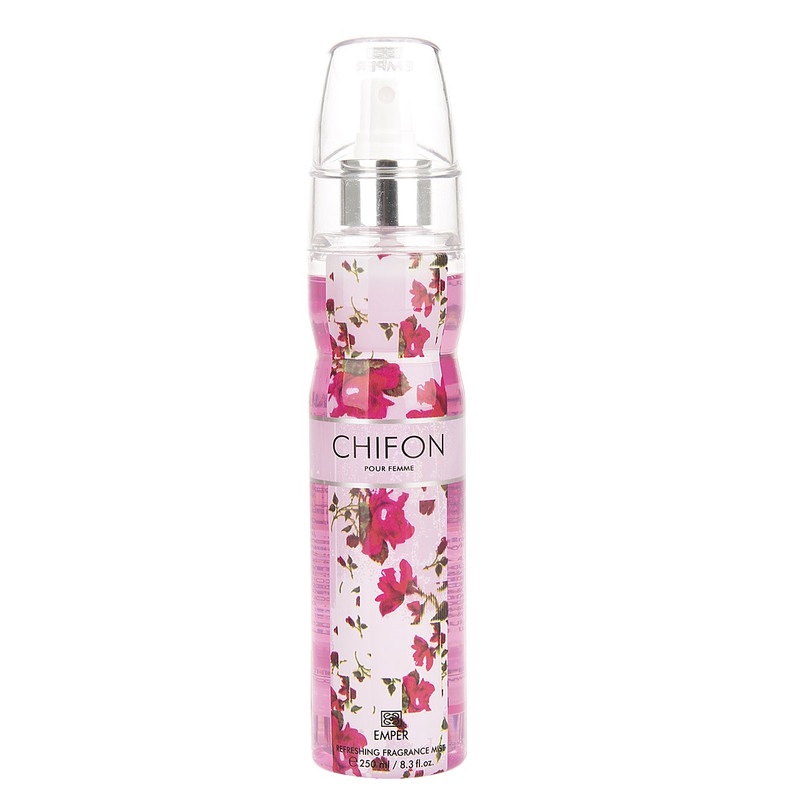 اسپرهای خوشبو کنندهی بدن یا همان بادی اسپلشها (Body Splash) جایگزین مناسبی برای عطر هستند. نمونهای از این اسپریها، مدل «Chifon» از برند اماراتی «امپر» (Emper) است. پیش از این امپر عطری خوشبو را با این نام عرضه کرده که مورد استقبال نیز قرار گرفته است. این اسپری زنانه که در حجم 250 میلی لیتر عرضه شده، دارای همان عطر و بو با ماندگاری نسبتا خوب است. این محصول را میتوان بر قسمتهای مختلف بدن اسپری کرد. رایحهی اسپری شیفون متشکل از بوی گلها با ترکیبی از میوههاست و حسی از طراوات و شادابی را به فرد میدهد.